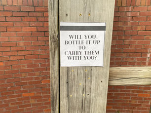 You walk up and grab a bottle with a name tag representing a fraternity brother or fellow art student and pour out their burdens (water). You then take this now empty bottle and fill it with whatever burden you write on a piece of paper. You are then presented with multiple options. Option number one you can throw it at yourself (a mirror) which indicates harming yourself with your burden. Option two you can throw the burden at me which is me representing a friend or other person indicating harming someone else with your burden. Option three was a safe space and the ideal smash zone for the bottles. There was an Option four where the person could leave with the bottle but it's not presented via sign like the rest.